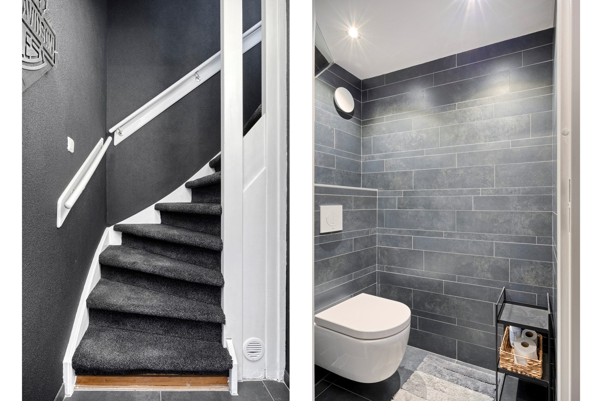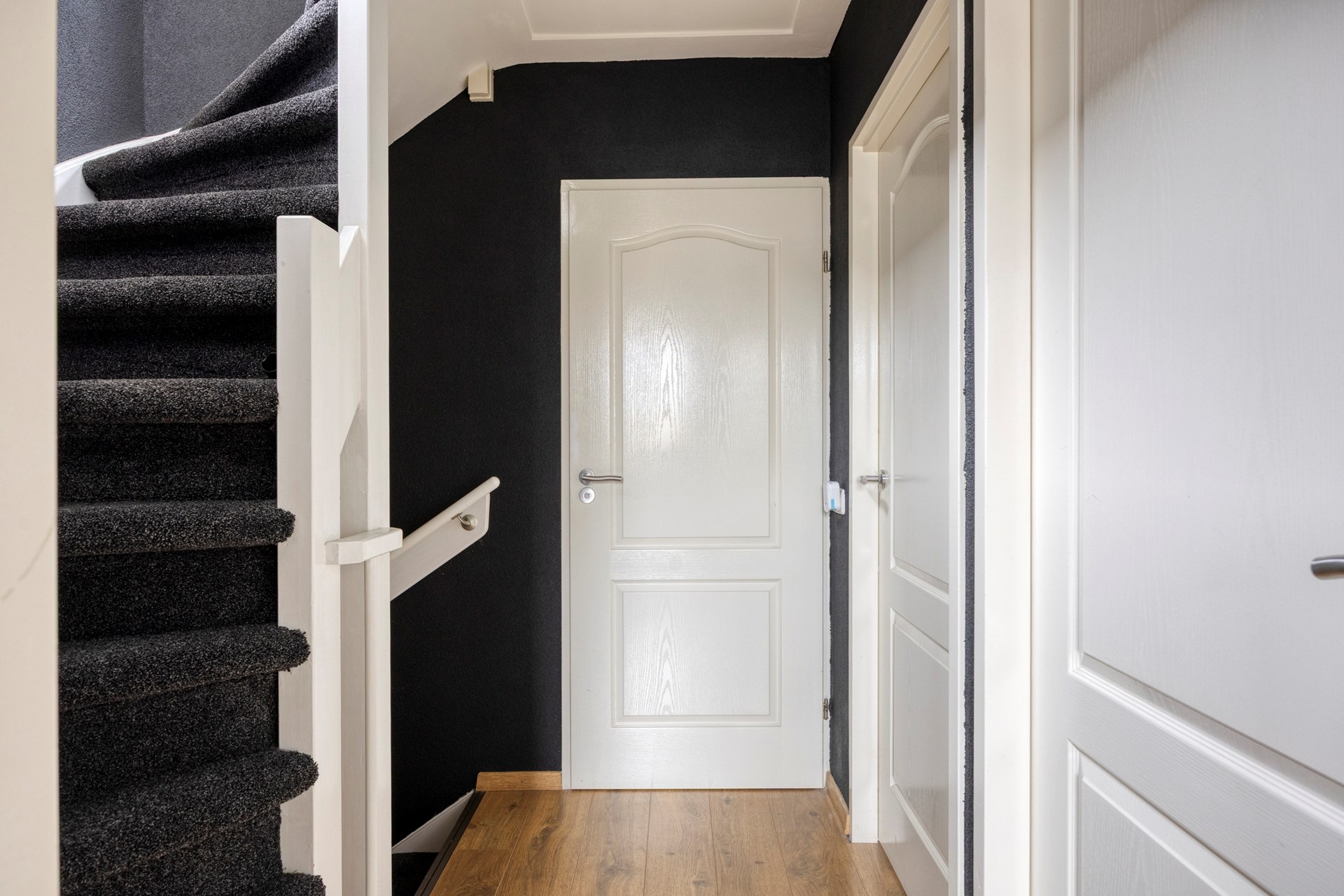 Via een tussenportaal kom je uit bij de trapopgang naar de eerste verdieping en ook tref je hier de toiletruimte aan.