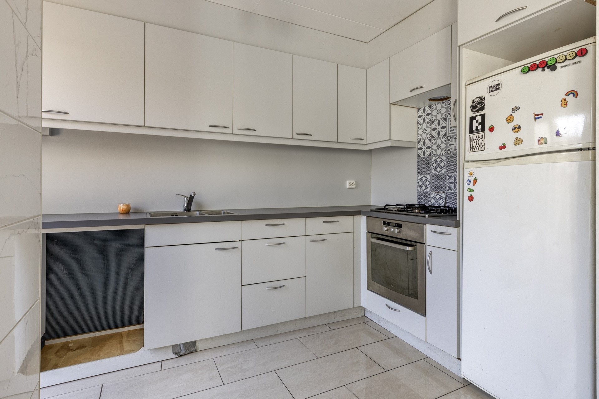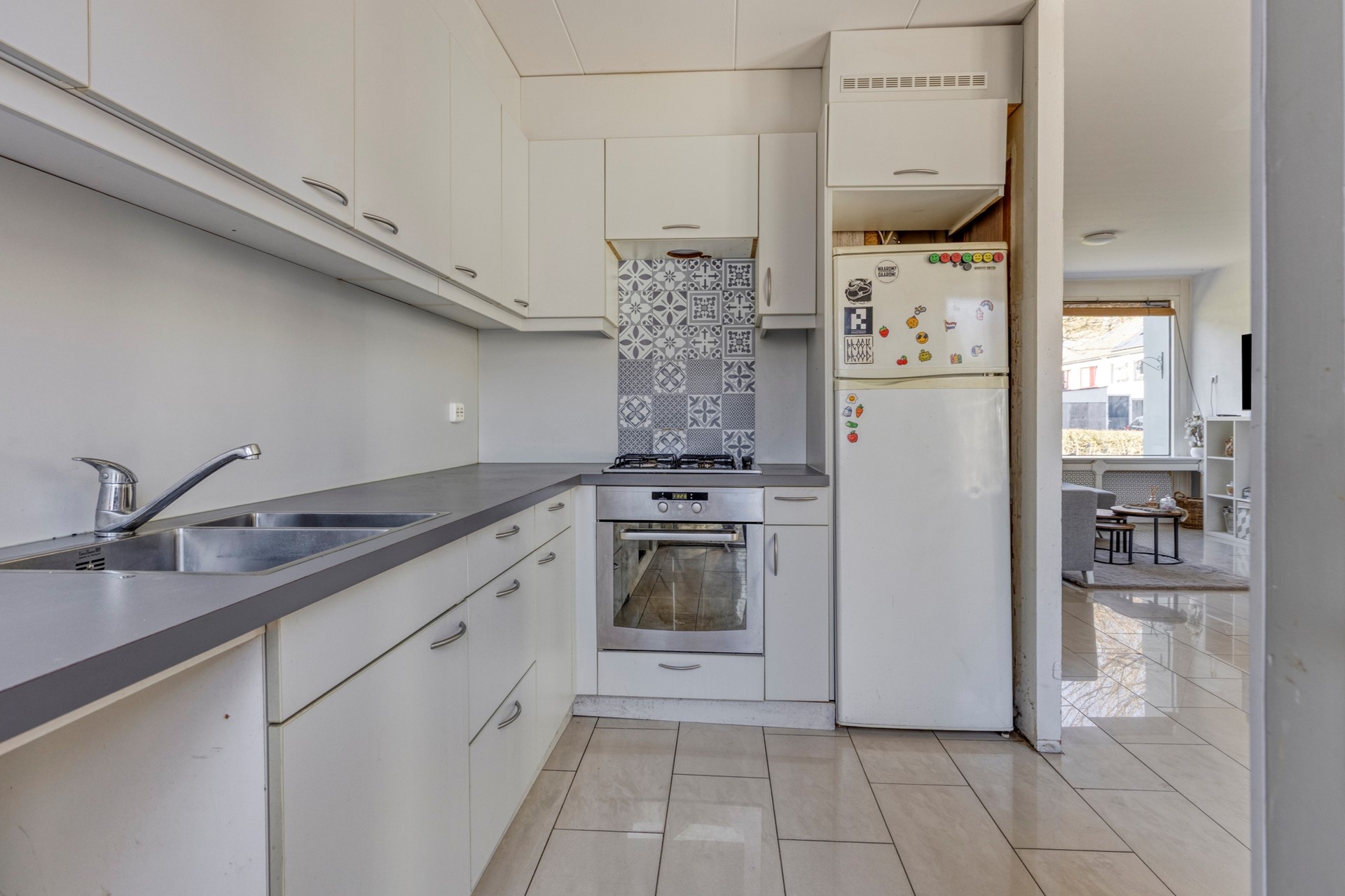 De gehele begane grond is afgewerkt met een moderne tegelvloer en strak gestucte wanden.