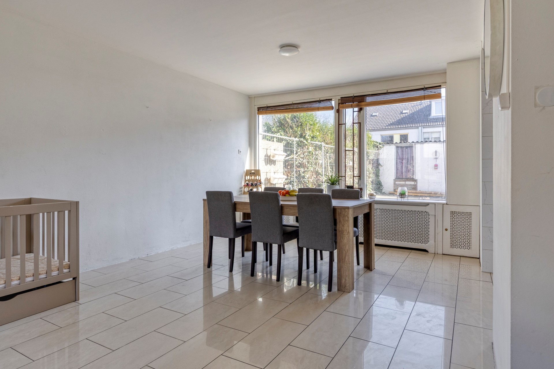 Aan de achterzijde is ruimte voor een royale eethoek met uitzicht op de achtertuin.