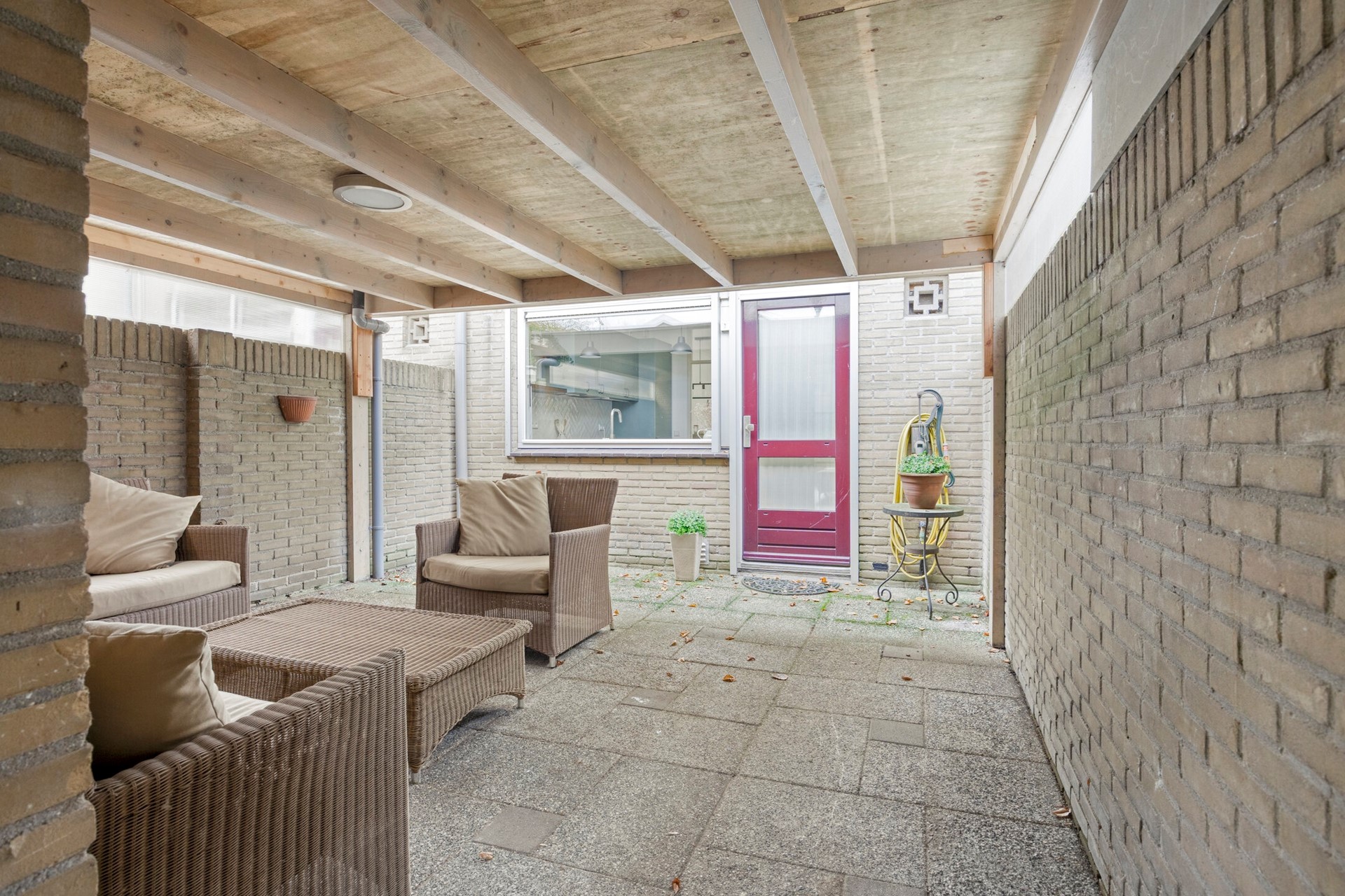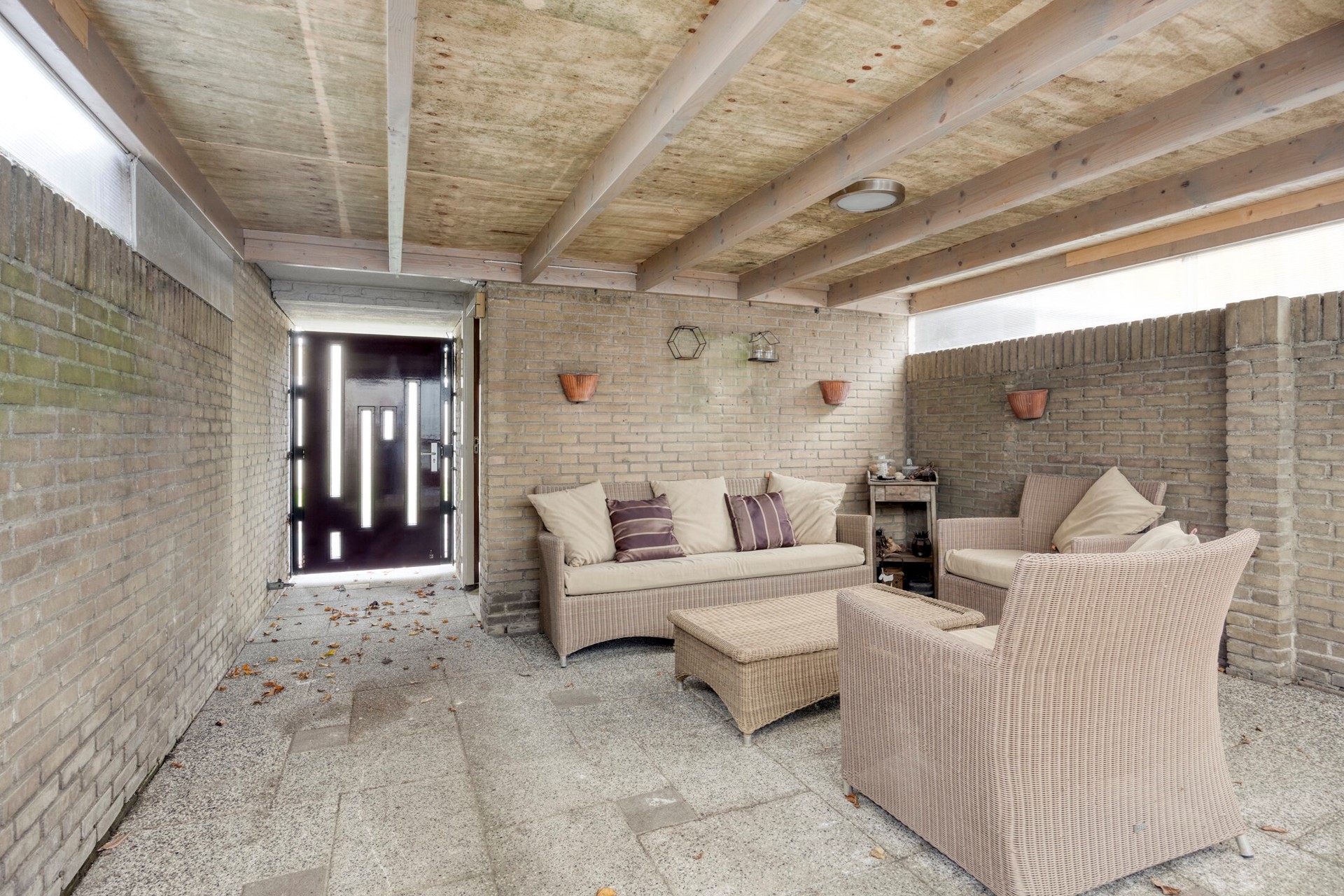 Dankzij de overkapping in de voortuin kun je ook op minder warme dagen heerlijk buiten zitten.