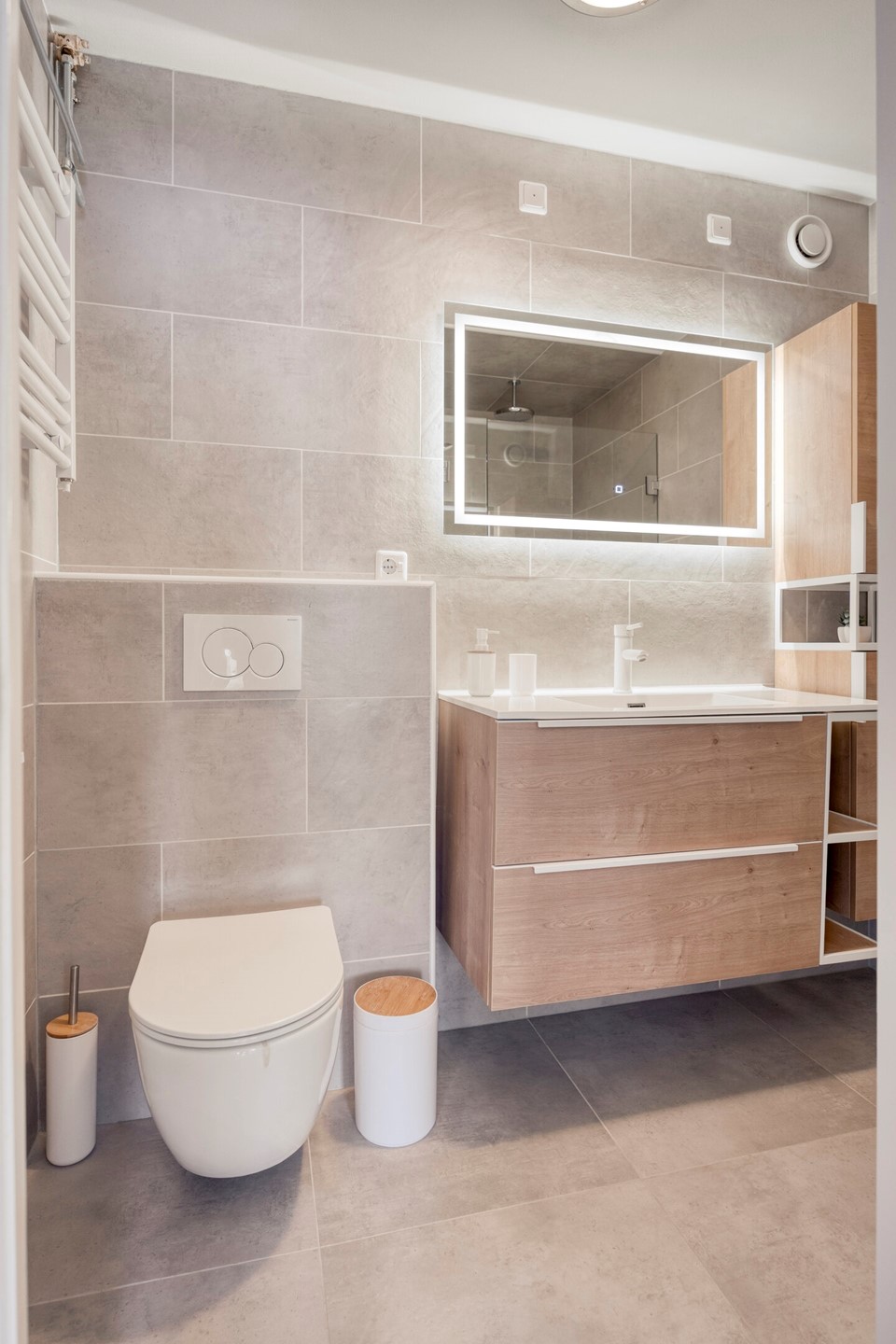 De keurige badkamer is uitgerust met een wastafel in meubel, badkamerspiegel met verlichting en verwarming, hangend toilet, designradiator en een inloopdouche. Daarnaast is er mechanische ventilatie aanwezig in de badkamer.