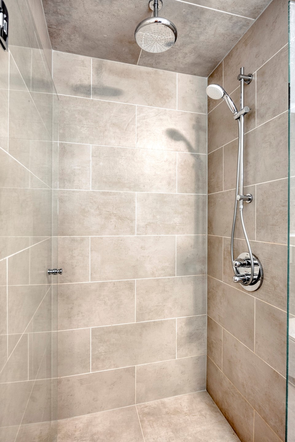 De badkamer straalt een ontspannen spa-gevoel uit, met onder andere een inloopdouche en een spiegel met licht- en verwarmingsfunctie.