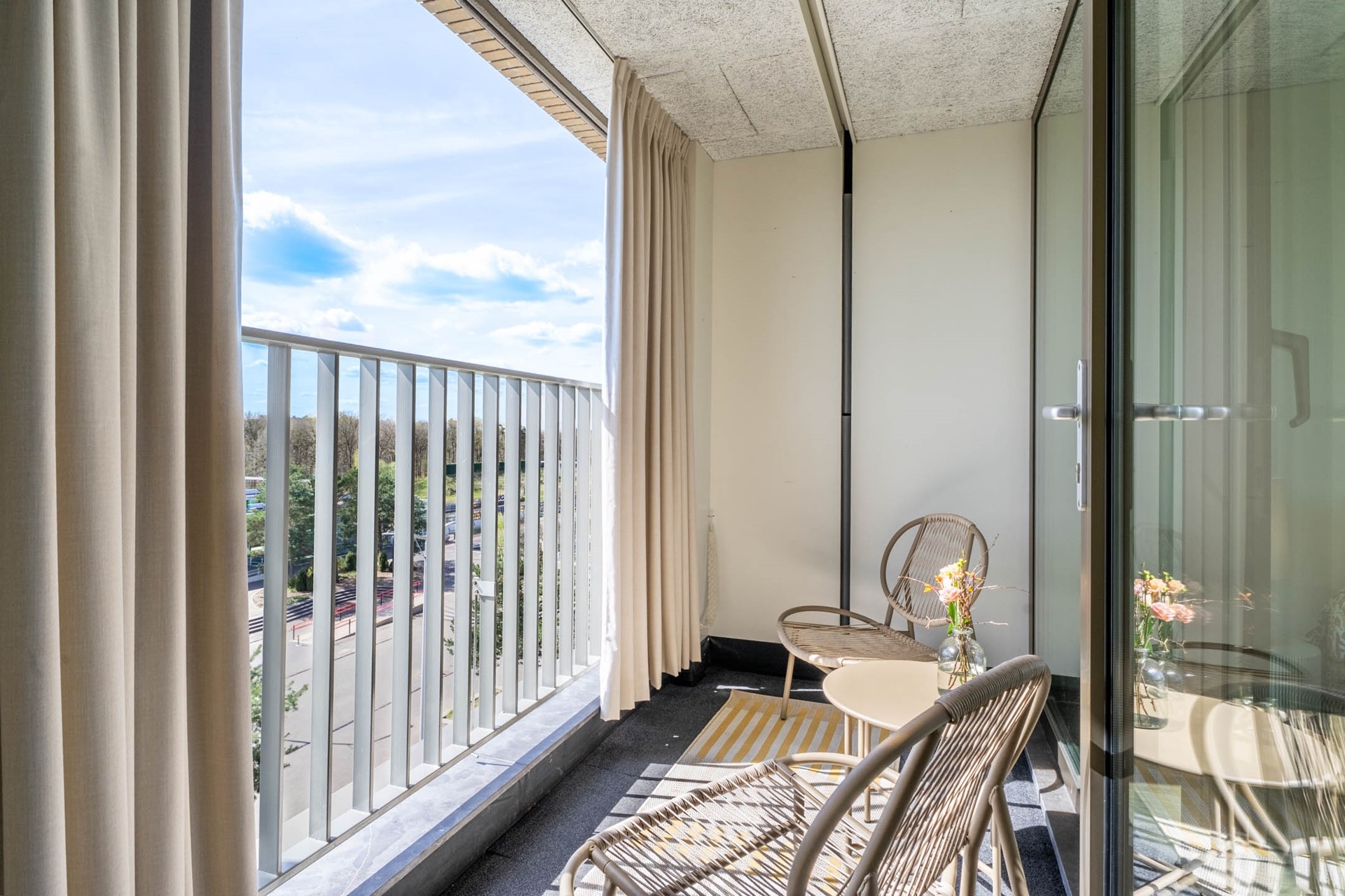 De woonkamer is licht en gezellig met grote ramen waardoor je veel lichtinval hebt. De ramen zijn voorzien van een elektrisch screen. Vanuit zowel de woonkamer als de slaapkamer heb loop je zo je inpandige balkon op. Deze is gelegen op het zuiden. De ramen van het balkon kunnen in zijn geheel open worden geschoven. Zon en weids uitzicht maakt dit een relaxte plek om je dag af te sluiten.