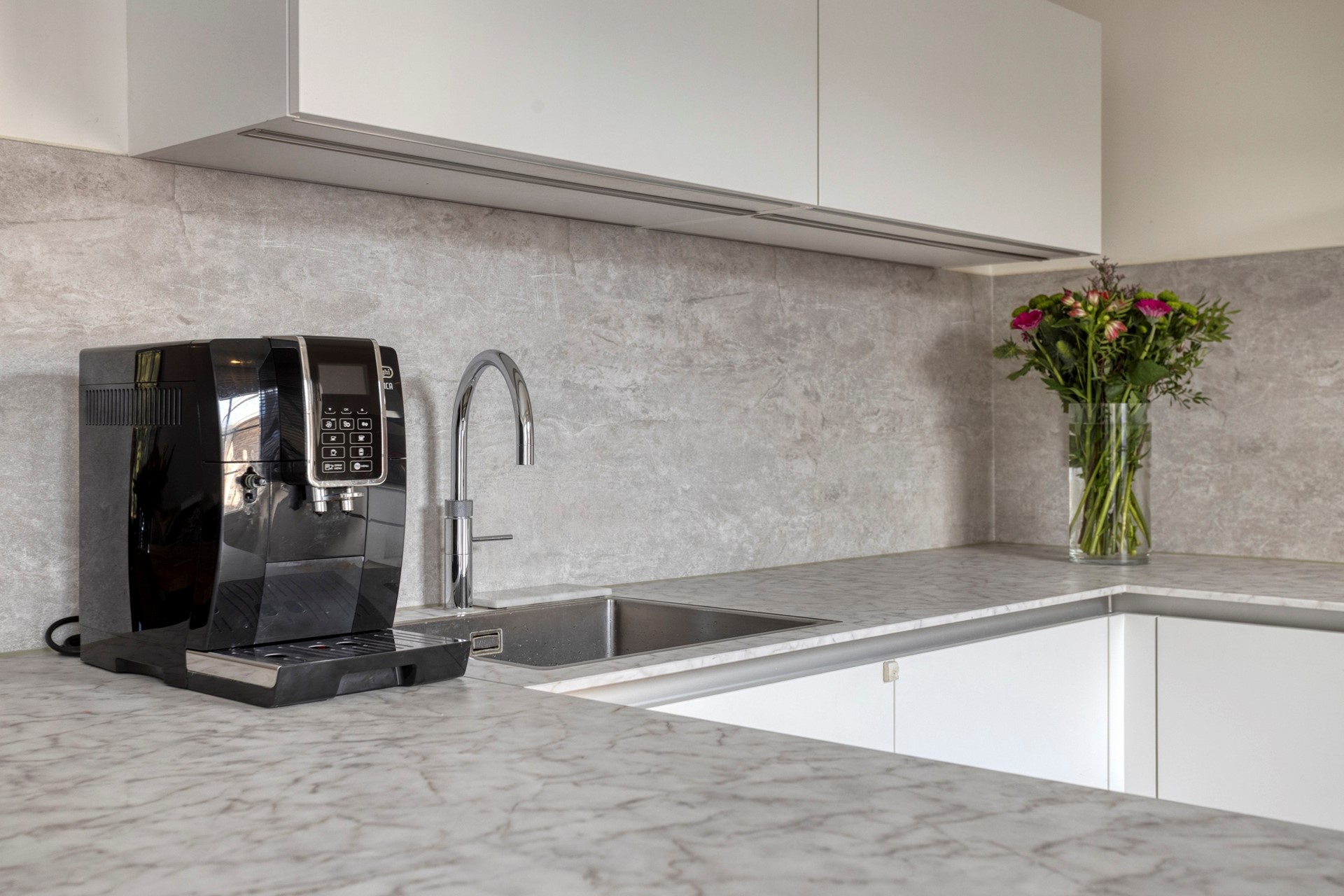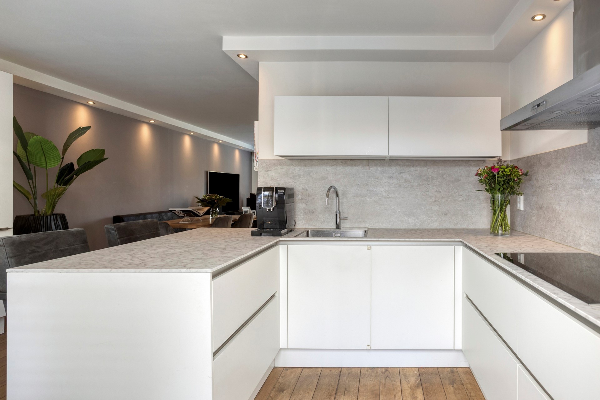 De keuken is een echte blikvanger. Uitgevoerd in een praktische U-opstelling met een sfeervol barretje en in het eetgedeelte nog een extra keukenblok. Deze moderne keuken is van alle gemakken voorzien zoals een vijfpits inductiekookplaat, afzuigkap, magnetron, oven, twee koelkasten, twee vriezers, een Quooker kokendwaterkraan en meer dan voldoende bergruimte waaronder een handige medicijnkast.