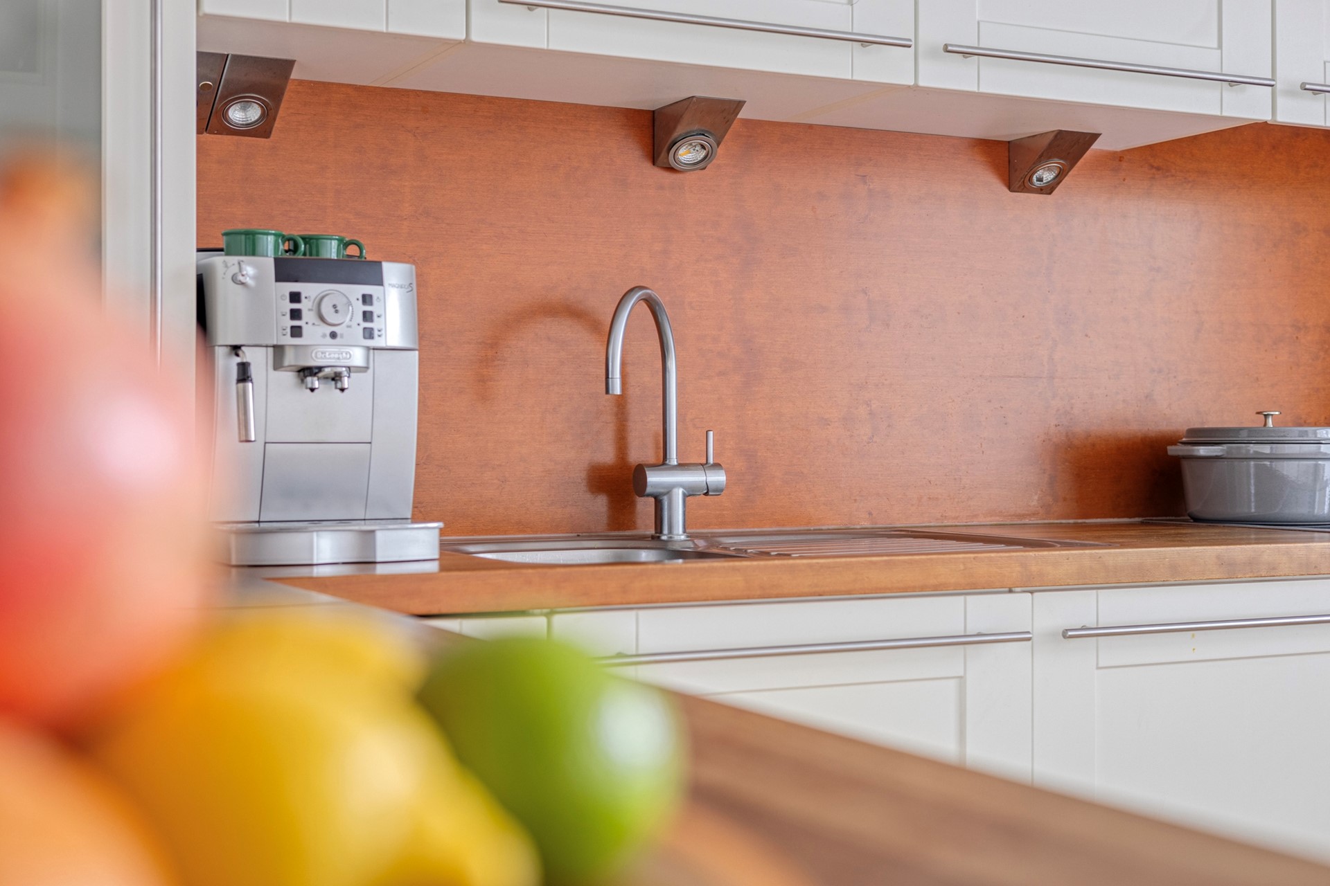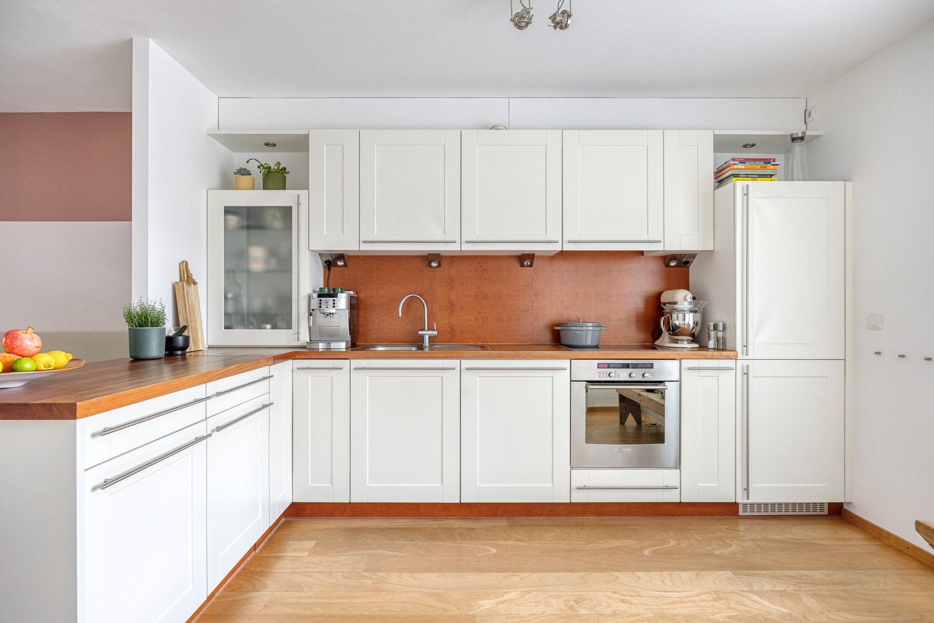 De keuken is gelegen aan de voorzijde en biedt vrij uitzicht over het groen. Deze is netjes uitgevoerd in een hoekopstelling met een verrijdbaar eiland. Dit betekent dat de keuken praktisch en flexibel is in te delen. De keuken is uitgerust met een inductiekookplaat, afzuigkap, combimagnetron, vaatwasser, koel-vriescombinatie en meer dan voldoende kastruimte.