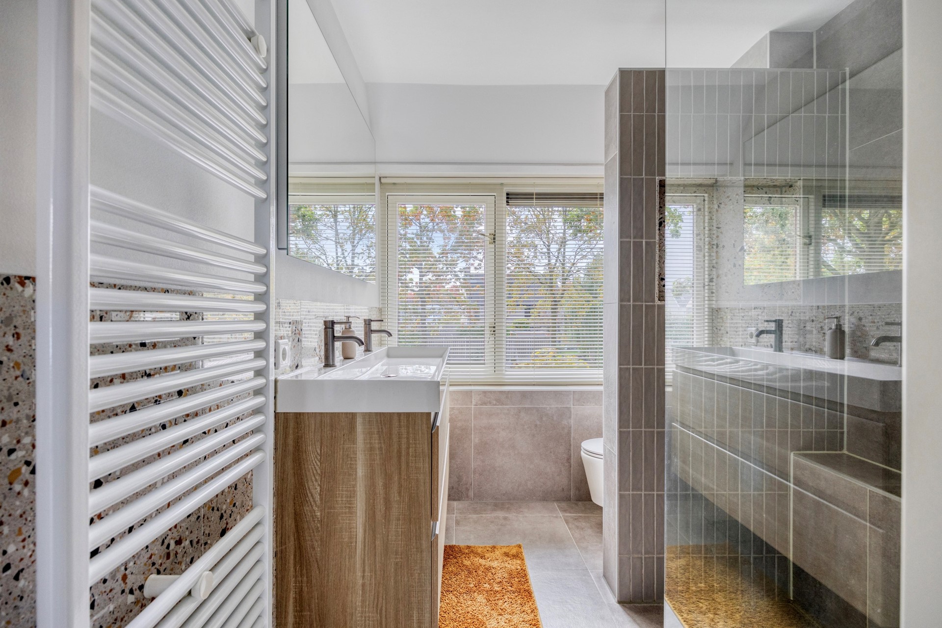 De badkamer is in 2021 vernieuwd en is helemaal van nu! Stap binnen in een moderne, sfeervolle badkamer waar aan alles is gedacht. De ruime inloopdouche met stijlvol nisje biedt volop comfort, terwijl de brede wastafel in een strak meubel met dubbele kranen perfect is voor het drukke ochtendritueel. Verder vind je hier een hangend toilet en een elegante designradiator. Zowel praktisch als een echte blikvanger. Een fijne, luxe ruimte waar je elke dag blij van wordt!